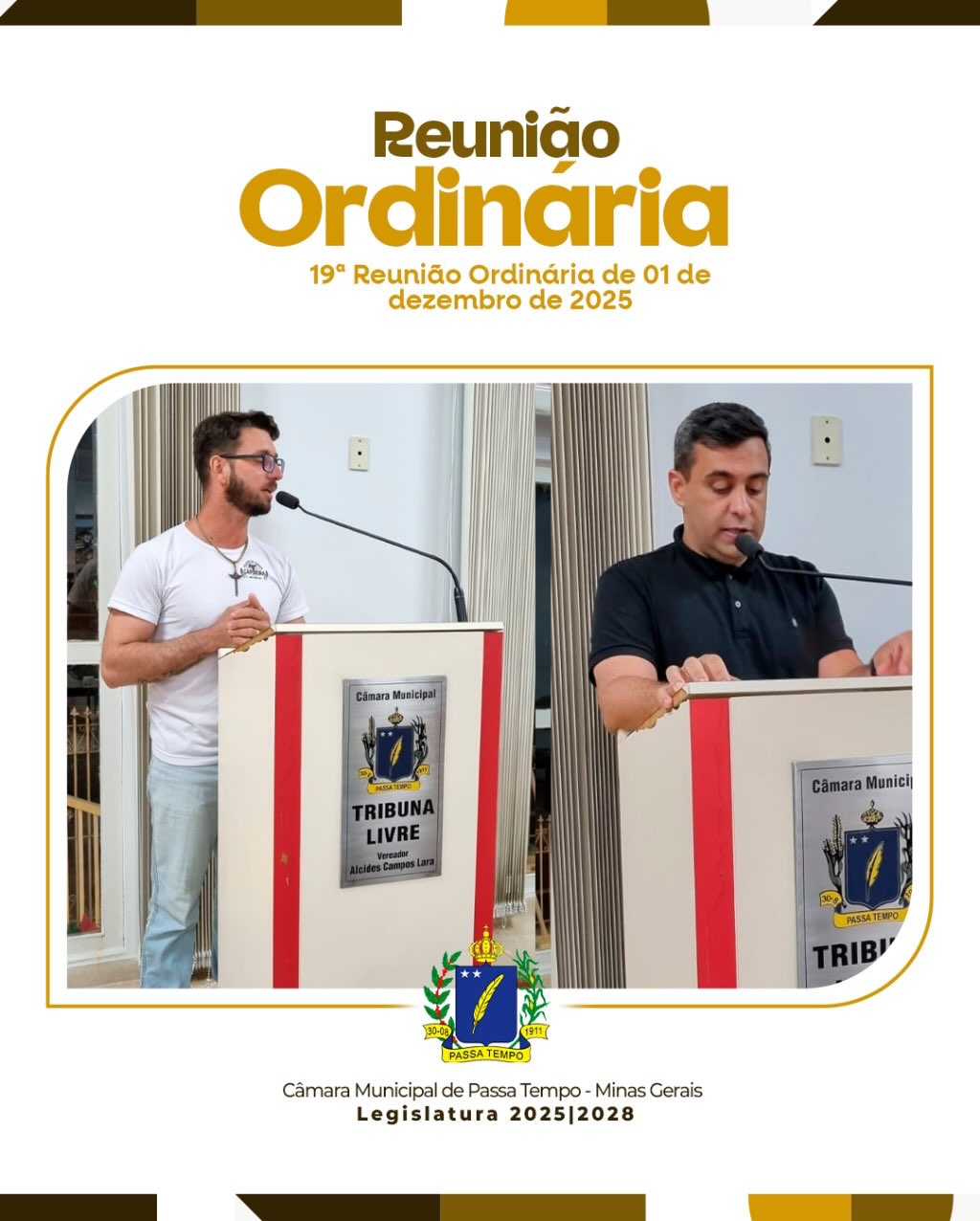A Câmara Municipal de Passa Tempo realizou no dia 1º de dezembro de 2025 a 19ª Reunião Ordinária, com todos os vereadores presentes.